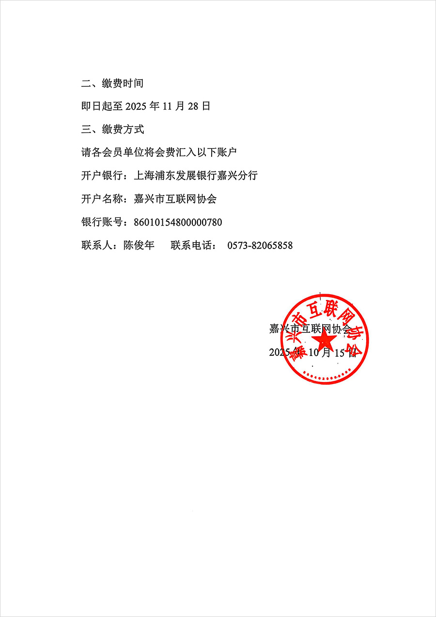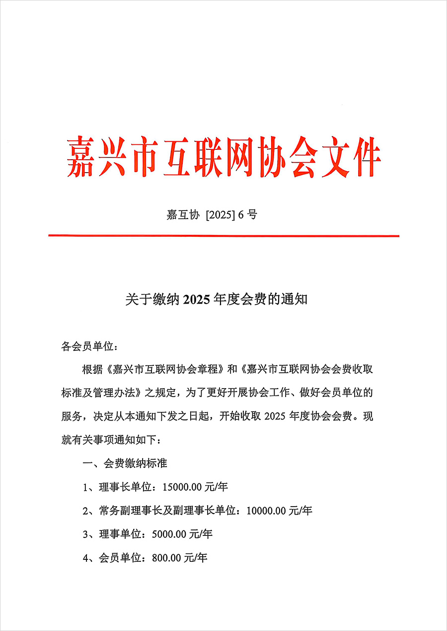 嘉兴市互联网协会关于缴纳2025年度会费的通知 嘉互协会[2025]6号